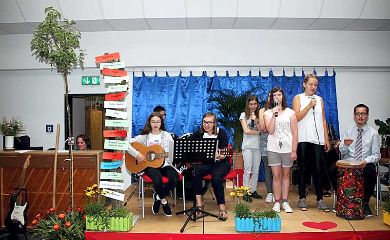 Musikalisches gab es von der NIG-Harly-Band mit Irgendwas bleibt und Sowieso. Lehrerin Angelika Knecht und Lehrer Johannes Lovis hielten die Rede des Klassenteams. „Vor zwei Jahren habe ich eine Kastanie in einen Eimer gepflanzt und habe die Patenschaft übernommen. Noch ist der Baum ziemlich klein, aber ihr seid viel selbstständiger und stärker geworden“, so Johannes.
