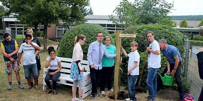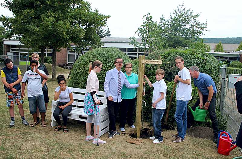 Nach der Entlassungsfeier wurde von den fünf Absolventen am Eingang der Schule ein Apfelbaum Jonagold-Winterapfel gepflanzt, passend zum Thema des Tages.