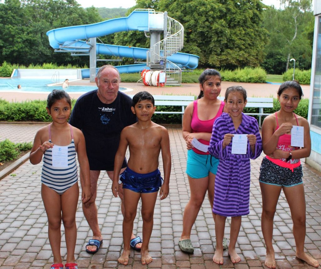 Insgesamt 28 Teilnehmer konnten erfolgreich den Schwimmkurs beenden, darunter 12 Flüchtlingskinder. Alle erhielten vom ehemaligen Schwimmmeister Klaus Gudewill die Urkunden für das bestandene Seepferdchenabzeichen.