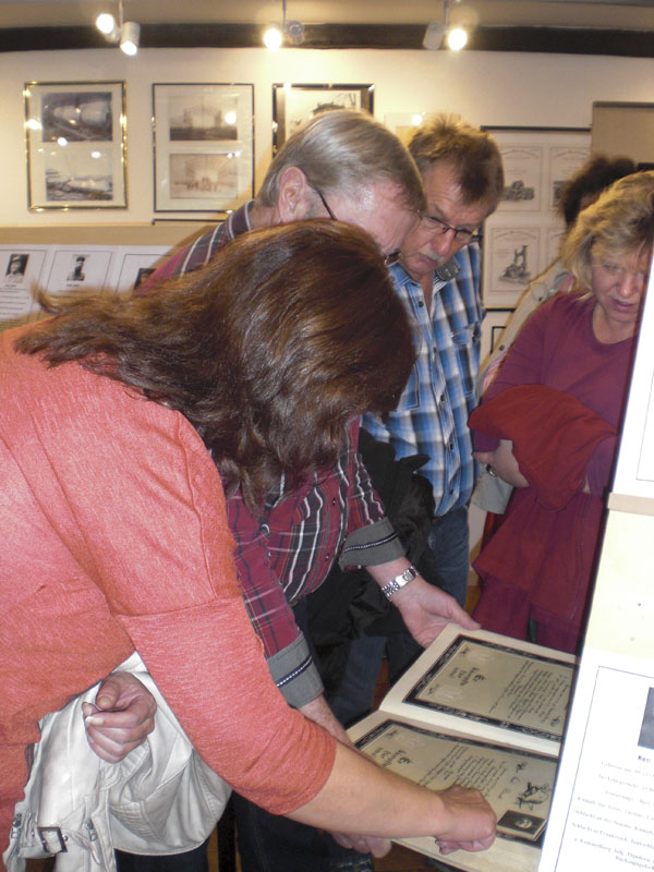 Mit einem Präsent und einer Urkunde bedankte die 1. Vorsitzende sich bei Hans-Gert Hotop für die große Mühe, die er sich mit der Vorbereitung hatte. Im Anschluss führte Hans-Gert Hotop durch die Ausstellung. Dabei interessierten sich die Besucher besonders für das Ehrenbuch, das als Quelle für die Soldatenporträts dient. Einige fanden überraschend ihren Vater oder Großvater darin. Bei Kaffee und Kuchen wurden dann noch die Erinnerungen weiter aufgefrischt.