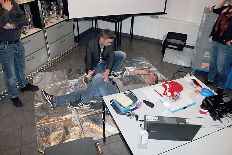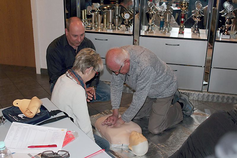 Stefan Meffert von der Firma Medictrain unterrichtete Vorstandsmitglieder, Übungsleiter und auch Jugendliche in der „Ersten Hilfe“. Verhalten am Unfallort, Notfallmaßnahmen, stabile Seitenlage, Herz-Lungen-Wiederbelebung aber auch die Nutzung eines Defibrillators standen auf dem Unterichtsplan.
