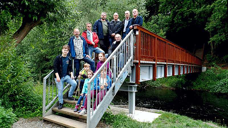 Danach ging es am Bahndamm, auf dem ein Anschlussgleis lag, und an tiefe Schluchten entlang, zum Schacht 1 des Kalibergwerks Hercynia, das 1930 durch einen Laugeneinbruch lahmgelegt wurde. Mit der Überquerung der im Frühjahr 2017 erneuerten Okerbrücke, die den Fußweg vom Vienenburger See zum Harly verbindet, verließ die Wandergruppe den Harlywald. Von dort ging es auf dem Wanderweg zwischen dem Harly, dem Vienenburger See und der Oker zum Veranstaltungsplatz zurück, um sich mit Kaffee, leckeren Kuchen und Waffeln zu stärken.