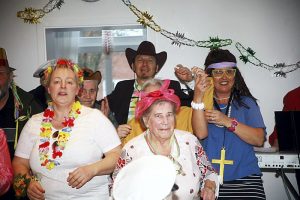 Auch das Pflege- und Betreuungsteam unter Leitung von Cowboy Norman Frenzel steuerte seinen Teil zum Gelingen des Faschingsfests bei. Es servierte nicht nur Leckereien wie Berliner mit Füllung und eine gehaltvolle Bowle, sondern forderte das Publikum mit Händen zum Himmel auch gleich zum närrischen Tänzchen auf. An der langen Polonaise durch zwei Festsäle beteiligten sich dann so manche Bewohnerin und Angehörige.