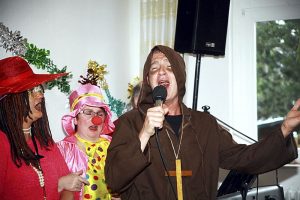 So begeisterte Mitarbeiterin Nicole Kaufmann als Zauberclownin das Publikum. Für jeden Gast hatte sie eine Luftballon-Wunschfigur gezaubert. Auch ein Chorknabe im Mönchsgewand wusste das Publikum für sich einzunehmen: Mitarbeiter Guido Hoffmann sang „Lili Marleen“ und sorgte dafür, dass viele der Bewohnerinnen und Bewohner auch diesen bekannten Marlene-Dietrich-Titel ihrer Jugendtage mitsangen: Unter der Laterne vor dem großen Tor.