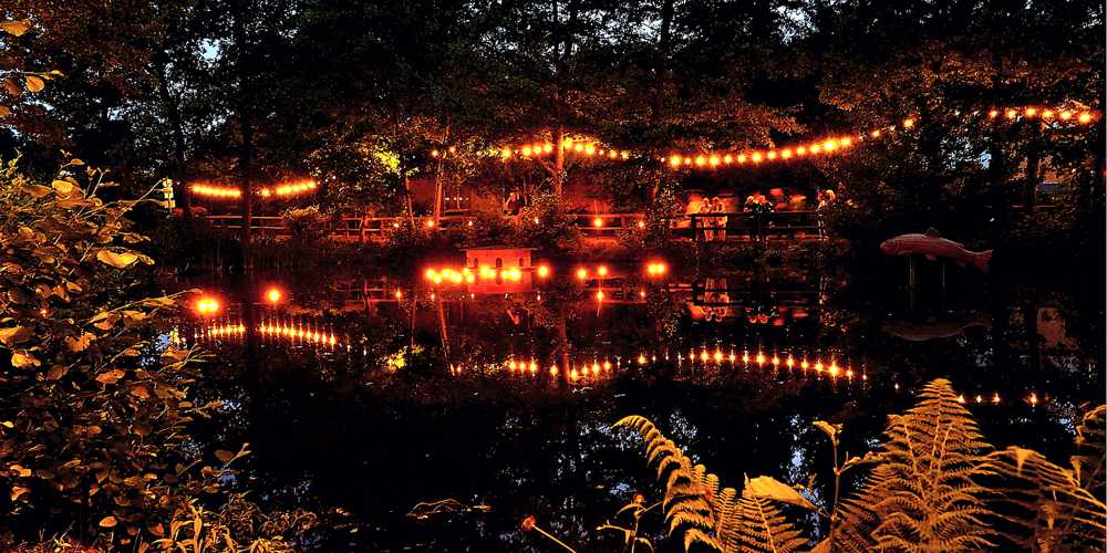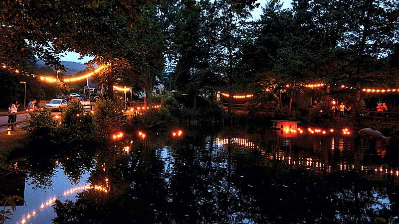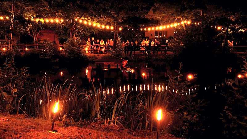 Der Dorfteich und seine Uferränder wurden am Samstagabend, den 3.6.2018 mit hellleuchtenden Glühbirnen an Lichterketten, aber auch mit brennenden Fackeln und Teelichtern illuminiert. Auf dem Teich schwammen brennende Teelichter, die sich teilweise dem hölzernen Entenhaus näherten.