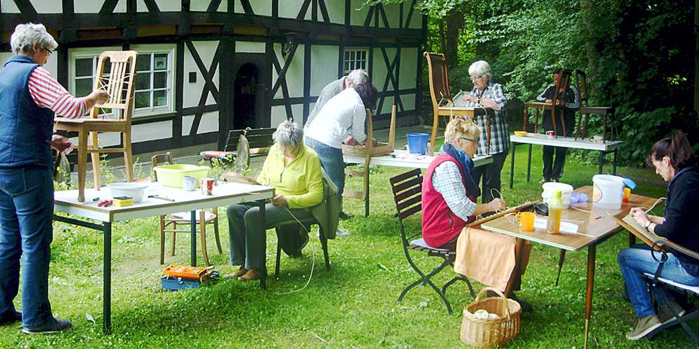 Der Förderkreis bot am Wochenende zum 2. Mal am Heimathaus Alte Mühle einen Kursus zum Flechten von Stuhlsitzen mit dem sogenannten Wiener Geflecht an.