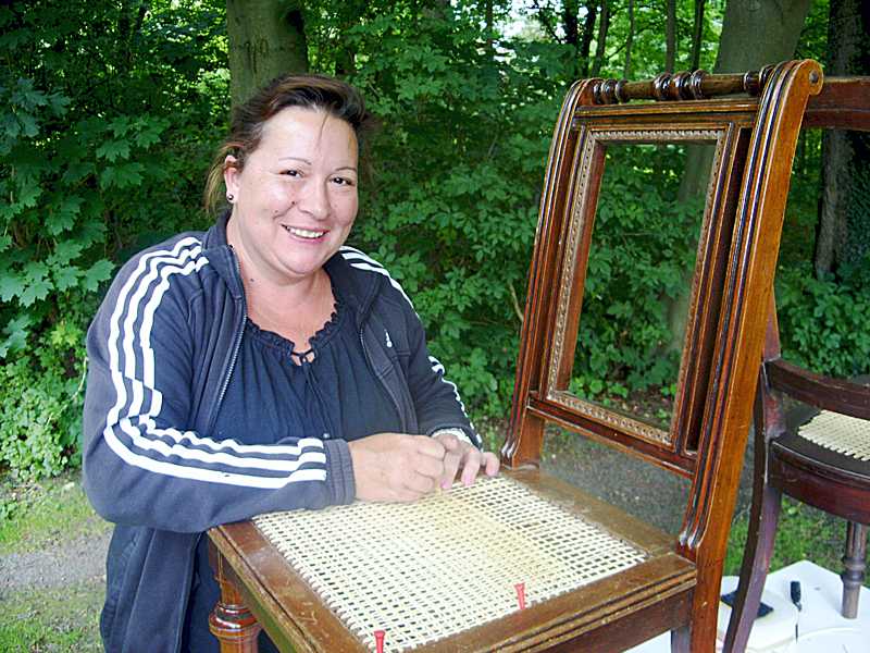 Am Anfang musste erst mal das alte Geflecht entfernt und die Löcher ausgebohrt werden, damit die neuen Fäden wieder Platz hatten. Nach Glätten und Streichen konnten die Teilnehmer endlich angefangen, die ersten feuchten Längsfäden einzuspannen. Nach dem 1. Quer- und 2. Längsfaden wurden die zweiten Querfäden als erste Fäden geflochten. Da kam mancher etwas durcheinander, was wieder korrigiert werden musste. Mit Feuereifer wurden dann die beiden Diagonalen eingezogen, womit das Geflecht erst ihr endgültiges Aussehen bekam.