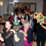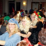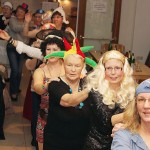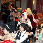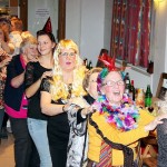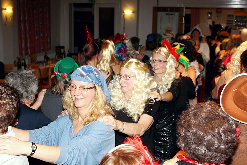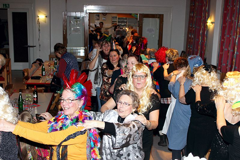 Ein weiterer Sketch spielte in einem Restaurant mit zwei noblen und zwei flippigen Gästen, einem Ober und einem Barkeeper hinter den Tresen und einem Gast vor dem Tresen. Damit zwischen den Auftritten kräftig getanzt werden konnte, sorgte Alleinunterhalter Rudolf Rönnecke mit „Danz up de Deel“, „Das rote Pferd“ und vielen weiteren Songs für Stimmung. Geschunkelt wurde nach „An den Nordseewellen“ oder „Heut wird ein Schwein geschlacht“. Mit einigen langen Polonaisen ging es quer durch den Saal, unterstützt durch Lieder wie „Mein Vater war ein Wandersmann“, „In der Lüneburger Heide“ und „Horch was kommt von draußen rein“. Es herrschte zwar kein Kostümzwang, aber viele waren bunt verkleidet. So sah man viele Fledermäuse, Schlafwandler, Cowboys, Köchinnen und Punker. Auch die Biene Maja war da und mach eine hatte nur einen bunten Hut auf. Für das leibliche Wohl sorgte das „Thekenteam“ mit Brygila Reimann, Jutta Scholz, Brigitte Schäfer und Angelika Pahl-Wellner.