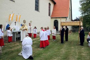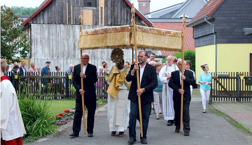 Es folgte der Baldachin, getragen von Alfred Bartsch, Richard Daubner, Ulrich Goldau und Günter Weniger, darunter die Monstranz mit dem Allerheiligsten, abwechselnd gehalten von Pastor Gerloff und Pater Austin. Daran schlossen sich die die Gemeindemitglieder und viele auswärtige Gläubige singend der Prozession an.