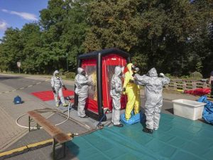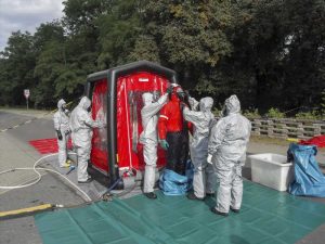Ein weiterer Trupp rüstete sich mit Schutzanzügen und Atemschutz aus, um die restliche Flüssigkeit abzupumpen. Mit einer speziellen Pumpe wurde das restliche Pflanzenschutzmittel aus dem Anhänger in einen separaten Behälter umgepumpt. Die Feuerwehr Cattenstedt stand mit der Dekon Komponente bereit um die Einsatzkräfte nach dem Einsatz zu dekontaminieren.