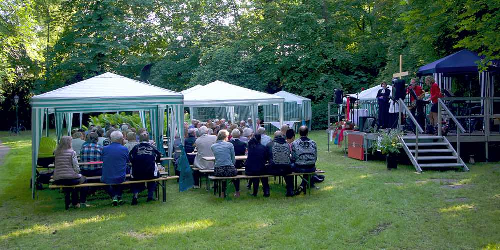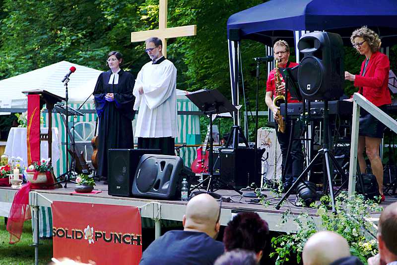 Zur Jubiläumsfeier am Pfingstsonntag hatte der Verein alle Vereine und Interessierte in den Krühgarten vorm Heimathaus Alte Mühle in Schladen eingeladen. Viele folgten der Einladung bei dem wunderbaren Sommerwetter. Um 18.00 Uhr begann dort der ökumenische Festgottesdienst mit Pastorin Achak und Herrn Schulte. Mit modernen Liedern und einem sehr stimmungsvollen Gottesdienst unter dem grünen Blätterdach des Krühgartens sprachen sie vielen aus der Seele. Dazu kam die musikalische Begleitung von Anja und Uwe Klußmann mit Keybord, Gesang und Saxophon. Dieses bildete einen gelungenem Auftakt für die anschließende Feierstunde.