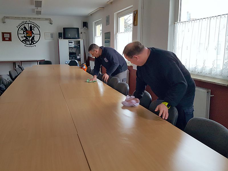 Unter dem Motto „Viele Hände schaffen bald ein Ende“ halfen alle tatkräftig mit. Bewaffnet mit Besen, Kehrblech und Putzmitteln wurde aufgeräumt, entsorgt, gewaschen und gewischt. Ob oben im Schulungsraum oder unten im Umkleideraum und der Fahrzeughalle.
