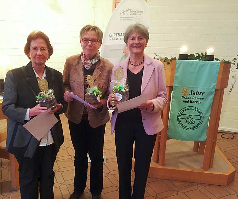 Klinikseelsorger Hartwig Wrede, Ärzte-Vertreter und Klinikleitung würdigten das ehrenamtliche Engagement auf einer Festveranstaltung in der St. Johanniskirche in Ohlhof.Grüne Damen