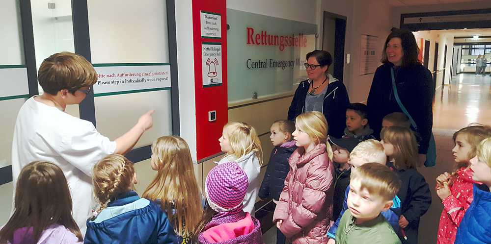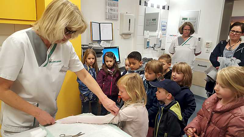 Regina Dorn, Leitung der Rettungsstelle, berichtete den fünf- und sechsjährigen Besuchern über die Versorgung von Verletzten und erklärte die detaillierten Aufgaben in einer Rettungsstelle. Krankenschwester Ute Schellhase legte einigen Kindern probeweise Gipsverbände an. Tipps von Profis, spielerisch erklärt – die Kinder und auch die Erzieherinnen waren begeistert. „Die Kinder hatten sich schon den ganzen Tag auf den Besuch in der Klinik gefreut, sie waren sehr beeindruckt“, sagte Erzieherin Heike Opitz, die zusammen mit ihrer Kollegin Birgit Schlüter die Gruppe begleitete.