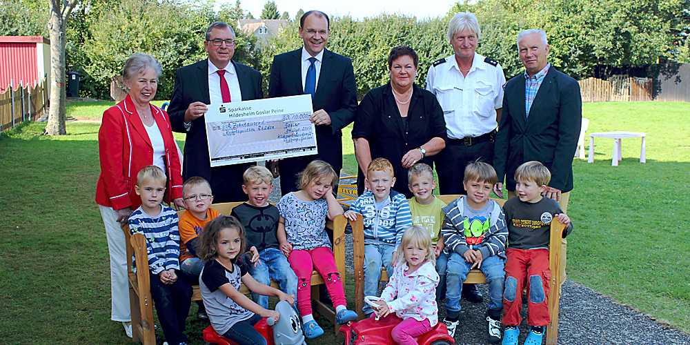 Die Mitglieder des Kuratoriums der Hildegard-Reisdorff-Stiftung, Annelore Lehrke, Christian Gleye (Vorsitzender), Rainer Walke und Gerd Lührig, überreichten den Scheck an Seesens Bürgermeister Eric Homann und an die Kindertagesstättenleiterin Petra Rieger. Da die Kindertagesstätte bereits mehrmals in den vergangenen Jahren von Hochwasser heimgesucht wurde, ist der Wunsch von allen Beteiligten ein Neubau.
