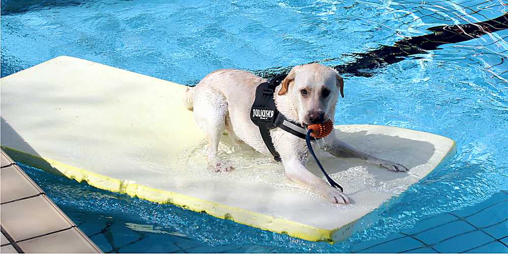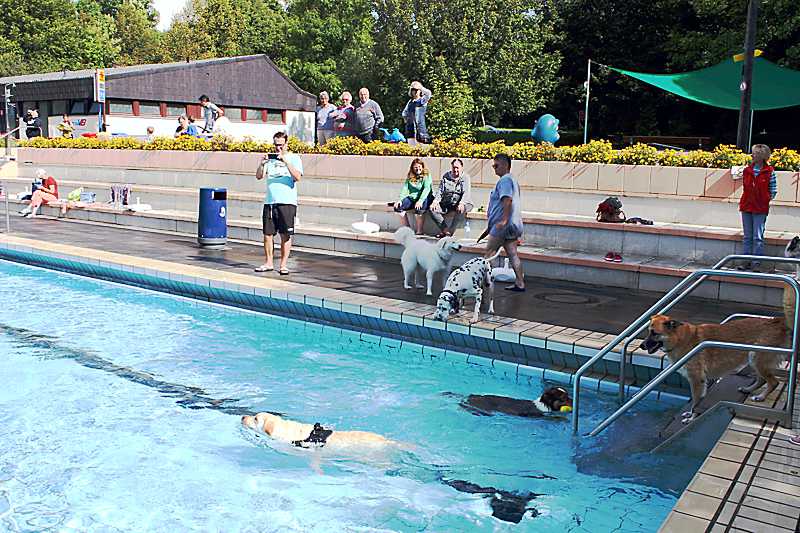 Es waren Hund und Frauchen oder Herrchen herzlich zum Hundeschwimmtag eingeladen, um in dem Becken zu planschen, wo sonst nur Zweibeiner zugelassen sind. Bei bestem Sommerwetter, das Wasser hatte 18,5 Grad, zog es 104 Hunde und über 200 Besucher in das Stadtbad. Einige Vierbeiner gingen alleine baden, aber auch Frauchen oder Herrchen gingen in das 65 Zentimeter tiefe Wasser.