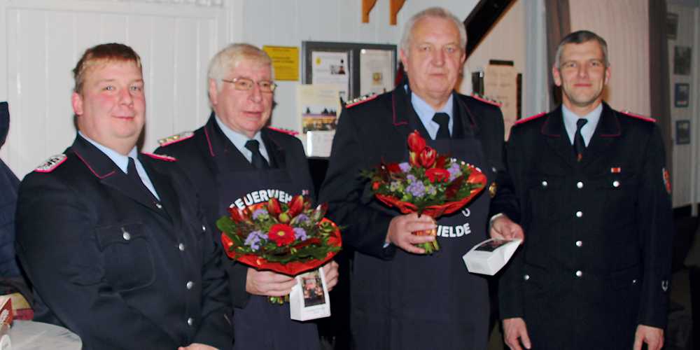 Gemeindebrandmeister Daniel Zalesinski beförderte Christoph Jürgens zum Löschmeister. Der ehemalige Ortsbrandmeister Herbert Meißner wurde für 25-jährige Mitgliedschaft mit der silbernen Ehrenmedaille des Landesfeuerwehrverbandes ausgezeichnet. Ortsbrandmeister Nils Bremer und sein Stellvertreter Oliver Zalesinski verabschiedeten den 1. Hauptbrandmeister Claus Moser und den 1. Hauptfeuerwehrmann Burghard Stiller aus Altersgründen aus der aktiven Wehr. Beide gehören nun der Altersabteilung an. Claus Moser hatte in den 45 aktiven Dienstjahren den Posten des Orts- und Gemeindebrandmeister inne. Da beide Hobbyköche sind, erhielten sie eine Schürze als Erinnerung.
