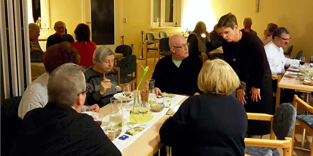 Es begann mit einer Andacht in der nahegelegenen Winterkirche, gehalten und musikalisch begleitet von Pastor Dittmann, und wurde dann im warmen Pfarrhaus bei Gulasch- und Gemüsesuppe, Wasser und Wein und zahlreichen leckeren Nachtischen fortgesetzt. Für eine lustige Unterbrechung der angeregten Unterhaltungen sorgte das Kirchenvorstandsduo Ute Oßwald-Franzke und Corinna Schlüter-Dech mit Sketchen aus dem Repertoire des Humoristen Loriot.