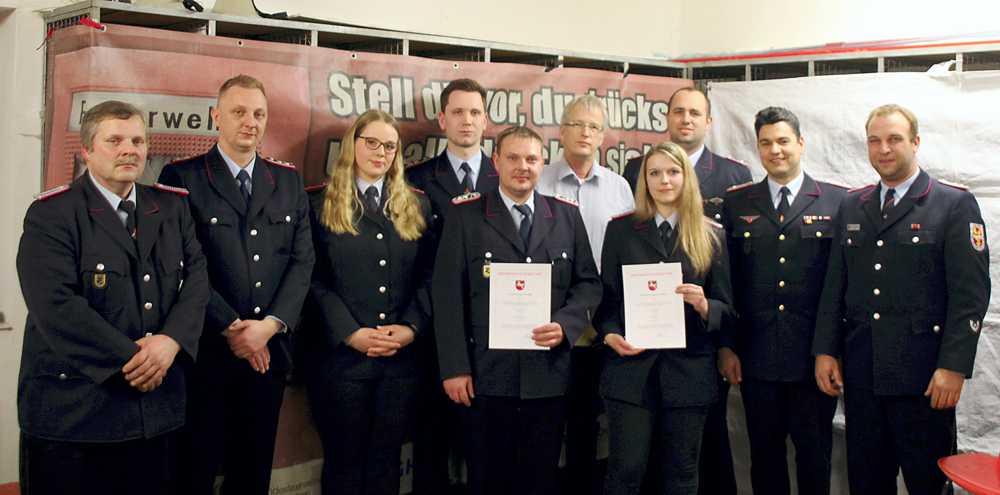 Der stellvertretende Ortsbrandmeister Tim Helbig wurde zum Hauptlöschmeister, Simon Gloger zum Oberlöschmeister und Lena Behrens zum Löschmeisterin befördert. Lena Behrens ist eine sehr aktive Feuerwehrfrau, sie hat eine Dienstbeteiligung von 100 Prozent bei einer Doppelmitgliedschaft mit Hornburg. Sie ist Leiterin der Kleiderkammer der Gemeinde Schladen-Werla in Isingerode, hat ihren Gruppenführerlehrgang mit der Note 1 in Celle bestanden und ist die erste Gruppenführerin in der Gemeinde mit der dazugehörigen Ausbildung.