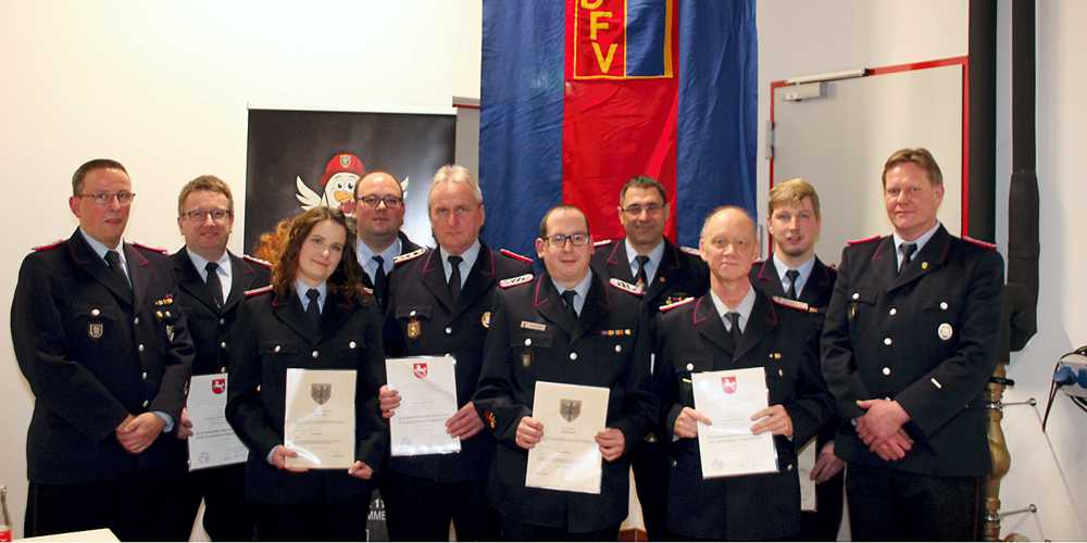 Für 25-jährige aktive Mitgliedschaft wurde Oberlöschmeister Björn Bosse und der 1. Hauptfeuerwehrmann Stefan Hubertus Scheer mit der Ehrenmedaille des Landesfeuerwehrverbandes ausgezeichnet. Oberbrandmeister Michael Martin, er ist alle Ämter durchgangen und war 12 Jahren Ortsbrandmeister, und dem 1. Hauptfeuerwehrmann Lothar Teichert wurden als Dank und Anerkennung für 40-jährige aktive Mitgliedschaft die Ehrenmedaille des Landesfeuerwehrverbandes verliehen. Florian Wildmann hat sein Amt als Gruppenführer zur Verfügung gestellt, hier ist Christian Friebel zum Gruppenführer der Gruppe 2 aufgerückt, neuer stellvertretender Gruppenführer ist Stefan Simon. Überstellt in die Altersabteilung wurde Ralf Huwald.
