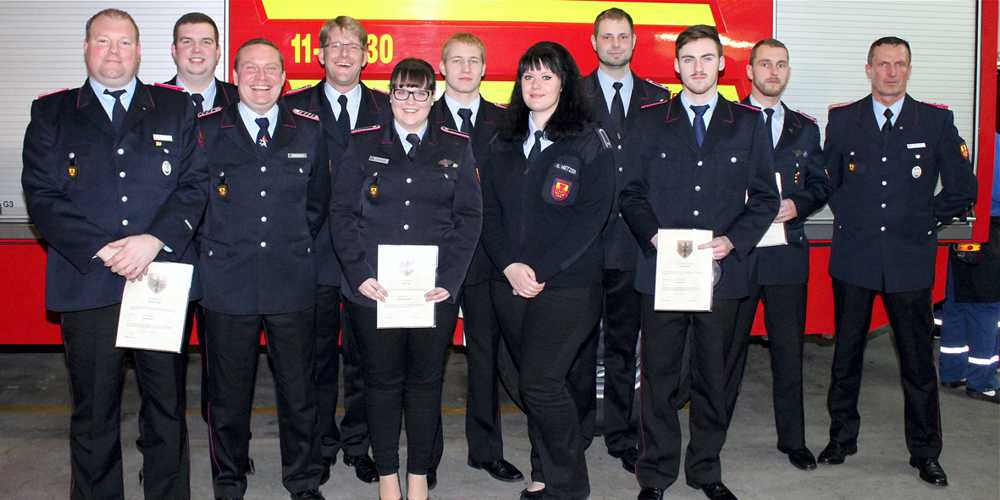 Zusammen mit Stadtbrandmeister Christian Hellmeier konnte Michael Jahn eine große Anzahl von Beförderungen in der Feuerwache vornehmen: