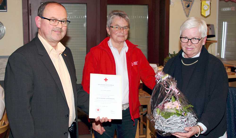 Der Geschäftsführer der DRK Kreisverbandes Goslar, Joachim Probst sowie die 1. Vorsitzende des DRK Ortsverein Helga Pape, zeichneten Annette Duderstadt mit der silbernen Ehrennadel des DRK Landesverbandes für 25-jährige Mitgliedschaft aus.