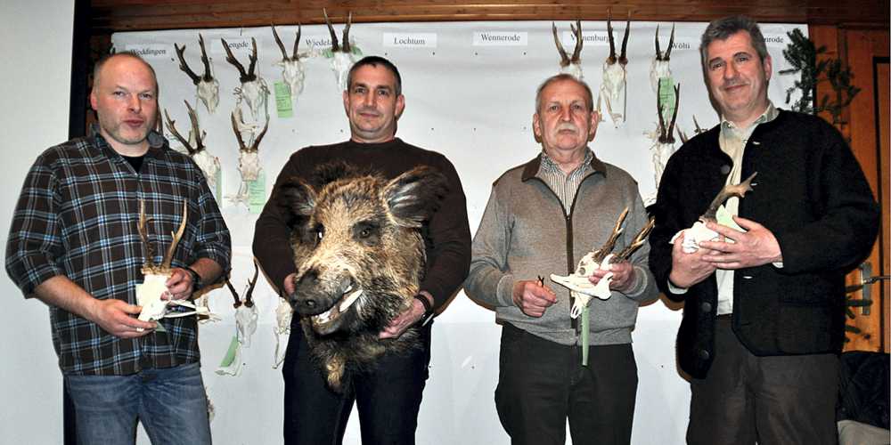 Bei der Auswertung der Jagdstrecke wurde ersichtlich, dass beim Schwarzwild 124 (im Vorjahr 47) und den Waschbären 104 (zum Vorjahr 69) die Jagdstrecke erheblich gestiegen ist, was auf einen hohen Bestand schließen lässt. Die Trophäenbewertung übernahmen Dirk Oppermann, Andreas Schrader und Henning Freckmann. Prämiert wurden der älteste Rehbock von Udo Thormann, Revier Wiedelah und der stärkste Rehbock von Nils Hundertmark, Revier Vienenburg sowie ein abnormer Rehbock von Gustel Bock, Revier Wiedelah.