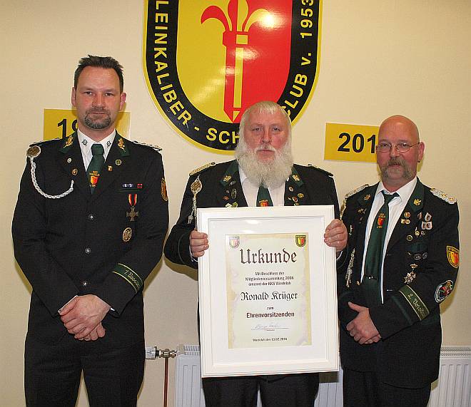 Weitere Ehrungen folgten, die Mitglieder Vera Krüger und Wolfgang Schwarze erhielten das „Protektorabzeichen in Silber“ vom Deutschen Schützenbund, gestiftet durch seine Hoheit Andreas Prinz von Sachsen-Anhalt und Gotha, für die Würdigung der Verdienste um das Deutsche Schützenwesen. Wolfgang Schwarze wurde für 25-jährige Tätigkeit als Schießsportleiter ausgezeichnet. Die Mitglieder Christa Kuszynski, Erika Schubert, Herbert Müller und Erik Marchi wurden mit dem Abzeichen in Silber für besondere Dienste im Verein ausgezeichnet.