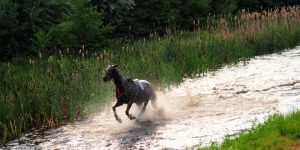 Stute Gelona galoppierte als vorletztes Pferd den See, rutschte nach wenigen Metern aus und fiel in das kühle Wasser.