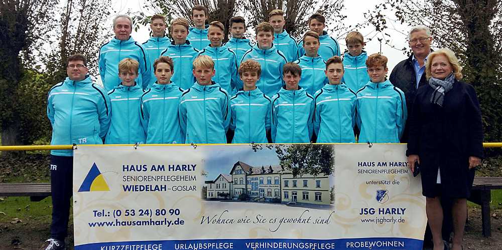 Die U15 (CI-Junioren) der JSG Harly bedankt sich beim Ehepaar Drude vom Seniorenpflegeheim Haus am Harly in Wiedelah für einen kompletten Satz Trainingsanzüge.