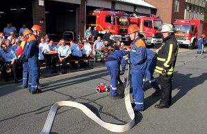 Grußworte zum Jubiläum sprachen Oberbürgermeister Dr. Oliver Junk, Stadtbrandmeister Christian Hellmeier, Ortsvorsteher Martin Mahnkopf, Stadtjugendfeuerwehrwart Markus Baginski und Ortsbrandmeister Michael Jahn.