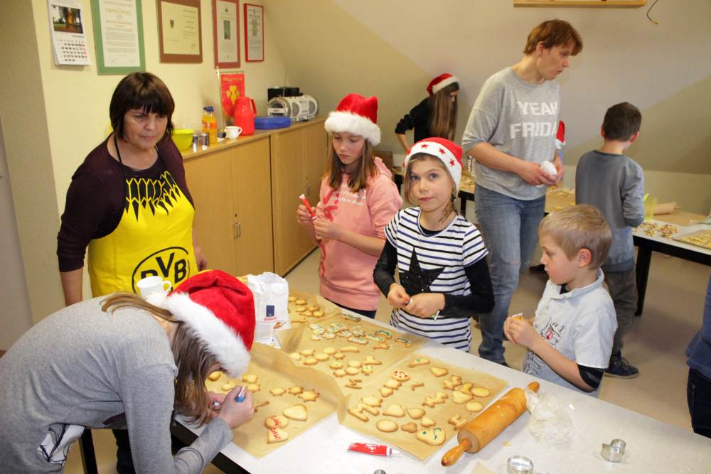 Christine Warnecke hatte den Mürbeteig bereits schon zuhause vorbereitet. Zwölf Kinder, bekleidet mit einer Weihnachtsmütze, wurden beim Backen von Monika Wendt, Giesela Bestmann, Marion Böntgen und Peggy Störmer begleitet. Mit verschiedenen Ausstechmotiven wie Rentieren, Herzen, Elchen, Mond und Sternen wurden die lustigen Motive auf dem Kuchenblech ausgestochen.