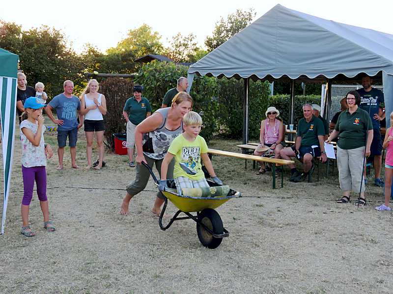 Matthias Böntgen hatte sich wieder viele Spiele ausgedacht: vier Mannschaften traten an, um mit einem gefüllten Becher über einen Schwebebalken zu balancieren. Großer Spaß kam auf, als ein Elternteil ein Kind in einer Schubkarre durch einen Slalomparcours fahren musste, dabei mussten einige Sachen wie Hose, Hemd und Schuhe eingesammelt werden. Am Ziel wurden die Sachen dann angezogen.