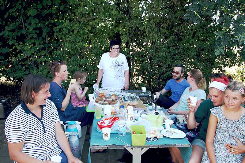 Der Mehrgenerationenspielplatz ist ein idealer Ort für eine Kennenlernfeier. An den Tischen und am großen Sandkasten kamen die Familien schnell ins Gespräch. Wegen der Trockenheit musste das Lagerfeuer, das zur späteren Stunde geplant war, leider ausfallen.