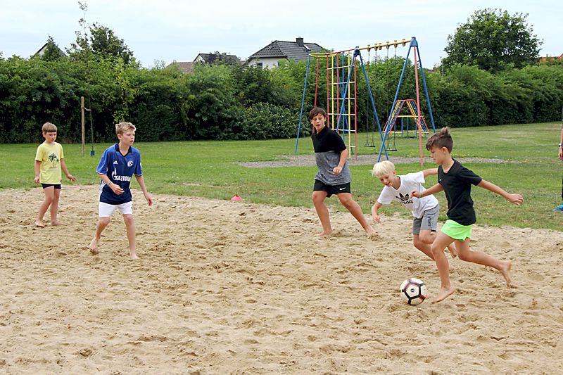Ausgerichtet wurde die Ferienpass-Aktion wie immer vom SV Schladen. Trotz einem wolkenverhangenen Himmel hatte sich eine Schar von 16 jungen Kickern auf der Beach-Soccer-Anlage eingefunden. Zunächst wurden vor Ort vier Mannschaften gebildet. Und nachdem sie sich ihre Mannschaftsnamen gegeben hatten, ging es nach dem Turniermodus Jeder gegen Jeden sofort los. Schnell hatten sich die Mädchen und Jungen im Alter von 8 bis 11 Jahren an den ungewohnten Sandplatz und das Barfuß-Spiel gewöhnt. Rund zwei Stunden lang wurde mit großem Eifer gekickt.