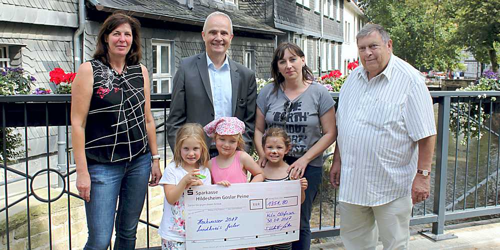 Im passenden Rahmen übergab Sabine Schlüter, Leiterin der Kindertagesstätte Regenbogen aus Othfresen, einen Scheck für die gemeinsame Spendenaktion des Landkreises Goslar, der Goslarschen Zeitung und der kreisangehörigen Kommunen zugunsten der Geschädigten des Jahrhunderthochwassers an Landrat Thomas Brych. Anwesend waren außerdem der Ortbürgermeister aus Othfresen, Bernd Möller, sowie Birgit Schlüter, eine Erzieherin der KiTa St. Georg in Goslar.