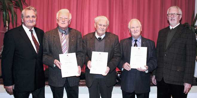 Bei der anschließenden Feierstunde im Bischof-Rese-Haus wurden langjährige Mitglieder geehrt. Präses Roland Wolf und Siegfried Wendler, Leiter der Kolpingsgruppe, ehrten Willi Singer für 50-jährige Mitgliedschaft. Bereits seit 60 Jahren gehören Bernhard Fricke und Klaus-Dietrich Wolf der Kolpingsfamilie an. Anschließend nahm Siegfried Wendler sechs neue Mitglieder feierlich in die Kolpingsfamilie auf: Annette, Rüdiger und Christian Hötzel, Artur Skutella, Florian Menzel und Marianne Wendler.