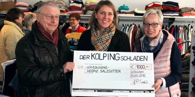 Normalerweise nimmt ein Geburtstagskind an einem solchen Tag kleine Geschenke entgegen, aber der Kolpingladen macht anderen Personen ein Geschenk. Die Mitarbeiter des Kolpingladen, Gabriele Koch und Günter Dietermann, überreichten Britta Bötel, Prokuristin vom Hospiz aus Salzgitter-Bad, einen Scheck über 1000 Euro.In dem Hospiz für Erwachsene finden acht Personen Platz.