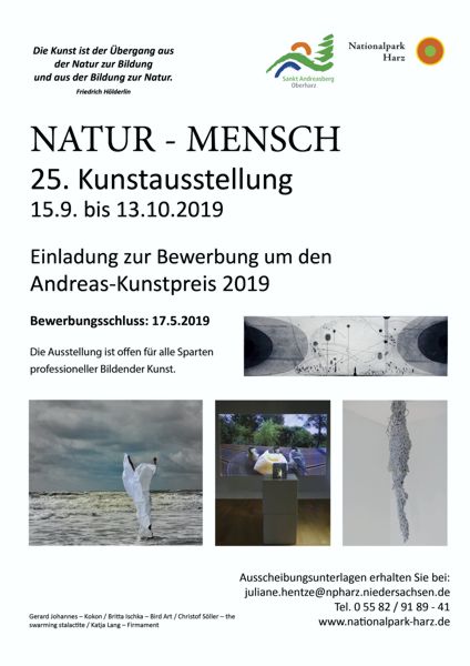 Es ist wieder soweit – die Bewerbungsunterlagen für die 25. Kunstaustellung NATUR – MENSCH sind online – Bewerbungsschluss ist der 17. Mai 2019. Die Ausstellung wird vom 15. September bis 13. Oktober 2019 in der höchstgelegenen Bergstadt des Oberharzes, in Sankt Andreasberg (heute ein Teil der Stadt Braunlage), stattfinden. Professionell tätige Künstlerinnen und Künstler sowie Studierende der Kunsthochschulen sind eingeladen, an der Ausstellung mitzuwirken und sich mit einem Werk zum Thema der spannenden und spannungsgeladenen Beziehung von Natur und Mensch zu bewerben.