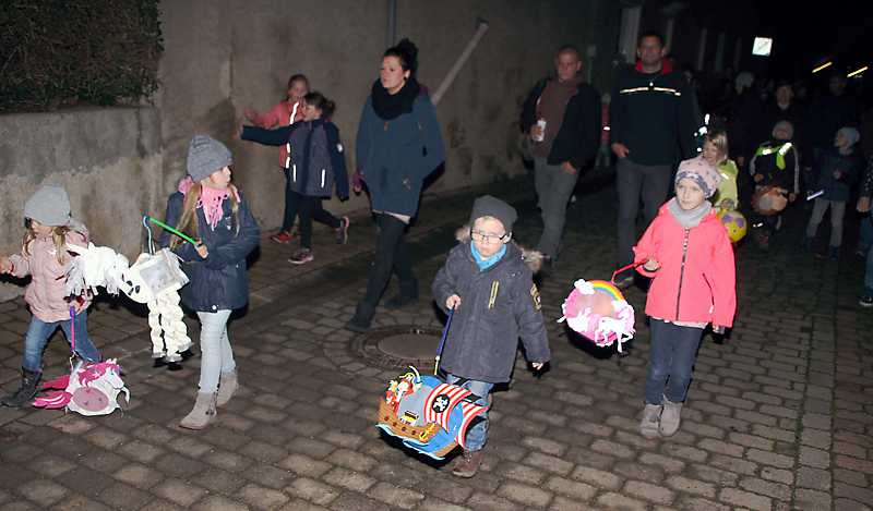 Fast alle Laternen waren selbst gebastelt, viel Motive gab es zu sehen wie Igel, Einhorn, Katze, Eule, Gespenst, Fußball und Hexe.