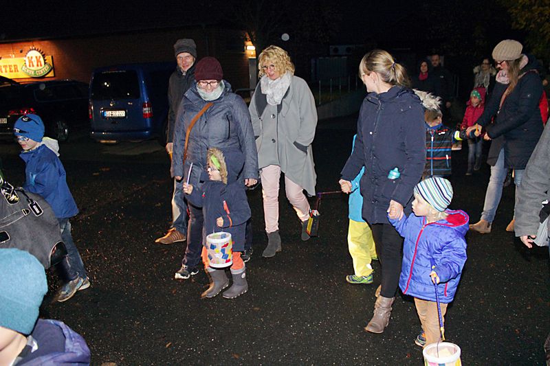 Vom Gelände des Kindergartens aus setzte sich der große Laternenumzug singend mit 110 Kindern und den Familienangehörigen über den Parkplatz des Einkaufszentrums in Begleitung der Polizei in Bewegung.