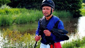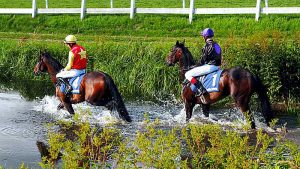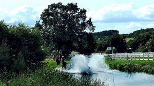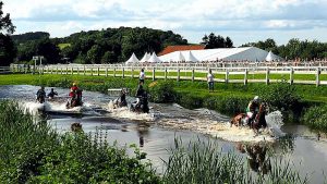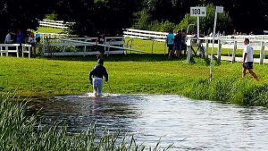 Im randvoll gefüllten Karl-Heinz Salzmann-See warf der 6-jährige Wallach Cro Easy seinen Reiter Julian Marinov aus dem Sattel. Die Sicherheitskräfte der DLRG brauchten nicht eingreifen.