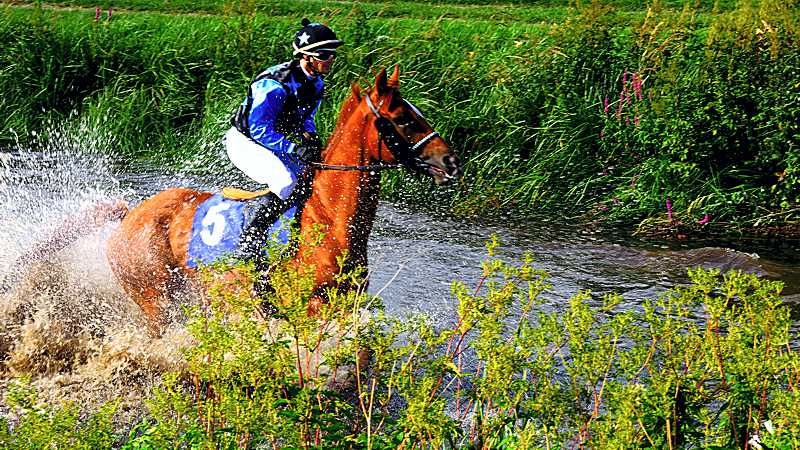 Im randvoll gefüllten Karl-Heinz Salzmann-See warf der 6-jährige Wallach Cro Easy seinen Reiter Julian Marinov aus dem Sattel. Die Sicherheitskräfte der DLRG brauchten nicht eingreifen.