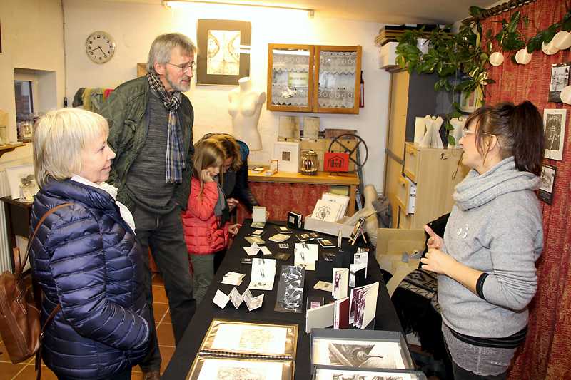 Liebevoll und bis ins Detail wurden Ausstellungsräume und Galeriegarten in ein Lichtermeer verwandelt. Neben den keramischen Arbeiten von Susann Broistedt, die mit ihrer unverwechselbaren und vielseitigen Handschrift weit über unsere Region bekannt ist, erwarteten die zwei Gastaussteller die vielen Besucher mit aus Fahrradschlauch genähten sowie kaligrafischen und druckgrafischen Arbeiten. So konnte jeder sein persönliches Lieblingsstück entdecken.
