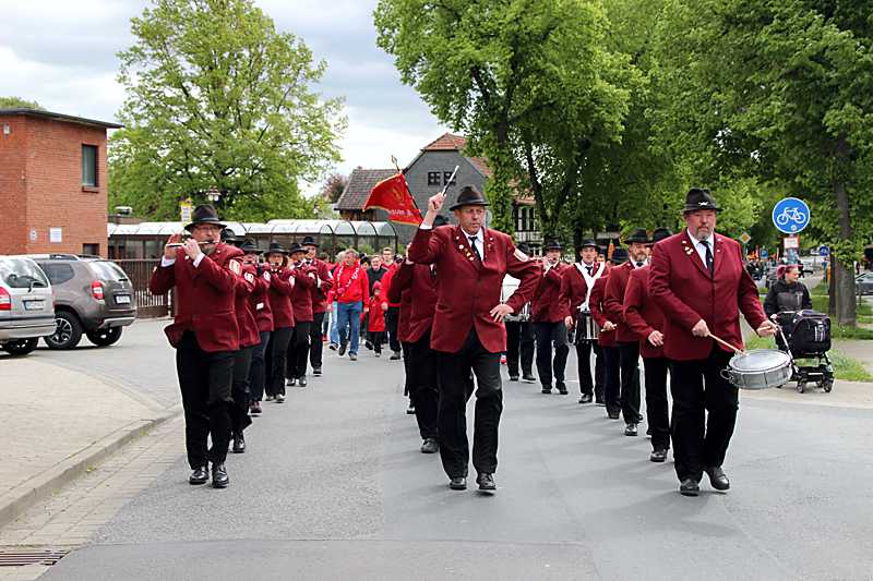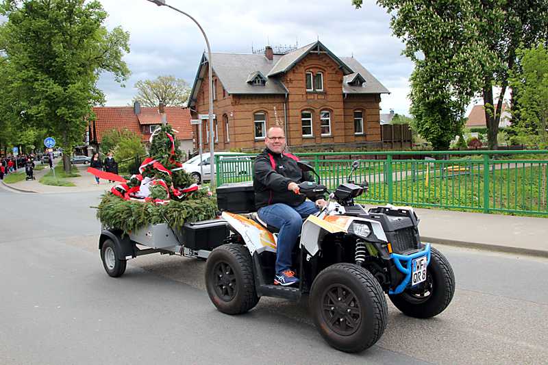 Der Start zum Festumzug erfolgte vom SV Sportplatz, angeführt mit dem Quad durch Martin Lieckefett und dem Maikranz auf dem Anhänger ging es zum Maifest zum Dorfgemeinschaftshaus (DGH). Musikalisch wurde der Umzug begleitet durch den Spielmannszug Schladen, zahlreiche Vereine und viele junge Familien mit Kindern. Vor dem DGH wurde der Maikranz mit einem Hubraumwagen durch Christian Koch und Sven Steinert an dem Gewerkebaum befestigt. Ortsbürgermeister Heinz-Jürgen Wiechens gratulierte dem SV Schladen, als Ausrichter unter dem Maibaum den 100. Geburtstag feiern zu können.