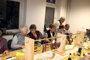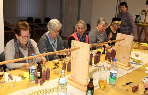 Die angebotene Mettwurst war von einem Schlachter aus Schladen, alle waren auf zwei Wurstständern fein säuberlich aufgehängt. Im Angebot gab es auch Harzkäse mit Schmalz und saure Gurken. Von einer ehemaligen Bäckerei gab es leckeres frisch gebackenes Krustenbrot dazu. In geselliger Runde, bei kalten Getränken und verschiedenen Teesorten wurde ein geselliger Abend verbracht.
