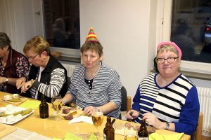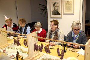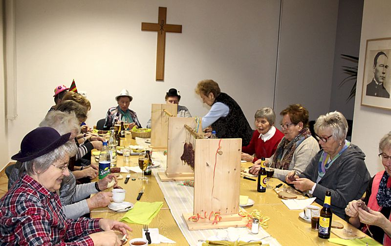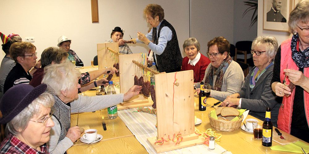 Erstmalig hatte die katholische Frauengemeinschaft (kfd) zu einem Mettwurstessen eingeladen. Die 1. Vorsitzende Barbara Irmler begrüßte im katholischen Pfarrheim Am Weinberg über 20 Damen, darunter einen Herrn, verkleidet als Scheich. Einige hatten bunte Hütchen auf, denn es ist der Ersatz für die in den vergangenen Jahren in der Karnevalszeit veranstaltete Faschingsfeier. Wie auch in den anderen Vereinen, leidet die kfd unter Nachwuchssorgen, viele der 31 Mitglieder sind schon im Seniorenalter.