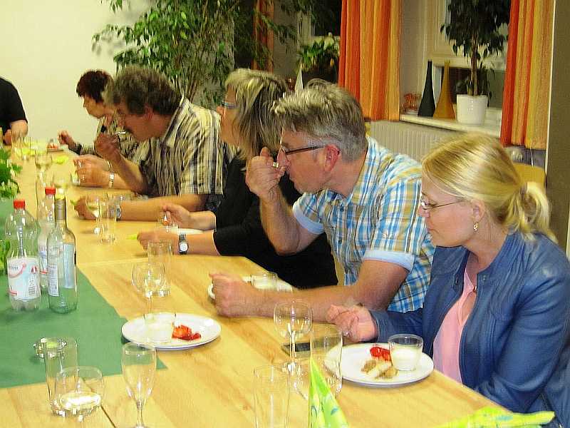 Gisela nahm den Kontakt auf und erhielt einen Termin für den 27. Mai. Innerhalb kürzester Zeit fand sich eine Gruppe von 16 Personen zusammen, die auch begeistert waren, darunter auch zwei Männer – Gerd Haarnagel und Swen Stolka. Alle wurden aktiv in die Zubereitungen einbezogen. Zur Begrüßung tranken wir einen „Hugo“ mit frischen Erdbeeren und probierten einen Kartoffelsalat im Glas.