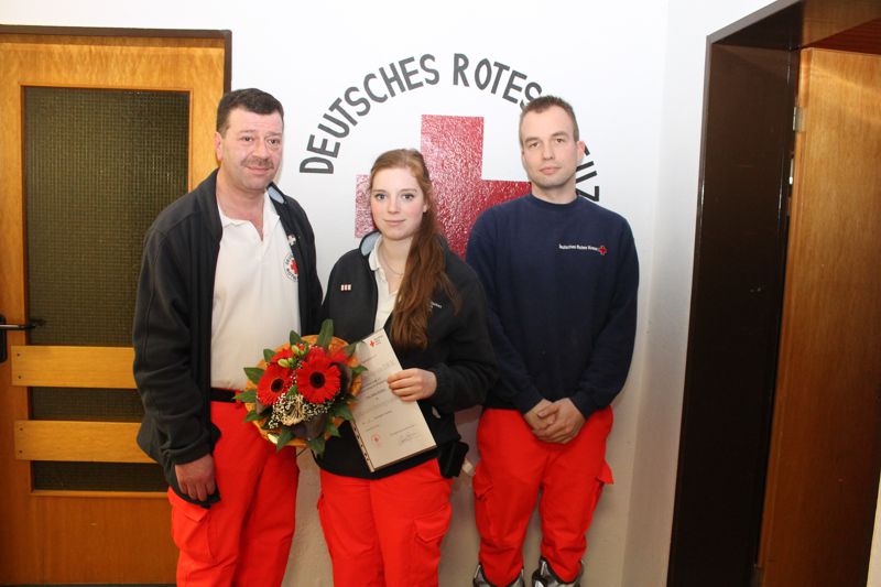 Foto zeigt Anika Körner, die für 15 Jahre aktiven Dienst eine Urkunde und Auszeichnungsspange erhielt.  Eingerahmt vom Bereitschaftsleiter Matthias Körner und seinem Stellvertreter Marian Fochler