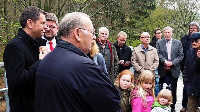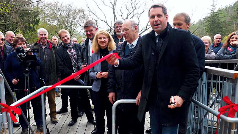 Bevor das rote Band an der Erlebnishängebrücke durchschnitten wurde, bedankten sich Aufsichtsratsvorsitzender Bernhard Düsing und Geschäftsführer Bernd Vollrodt der Kur-, Tourismus- und Wirtschaftsbetriebe der Stadt Bad Harzburg bei Minister Olaf Lies für seinen Besuch und baten ihn, bei der Lösung des gegenwärtigen Verkehrs- und Parkplatzproblems behilflich zu sein. Der Minister, der den Baumwipfelpfad am 7. Mai 2015 eröffnet hat, sagte seine Unterstützung zu und freute sich darüber, dass das touristische Angebot inzwischen rund 495.000 Menschen aller Altersgruppen besucht haben.